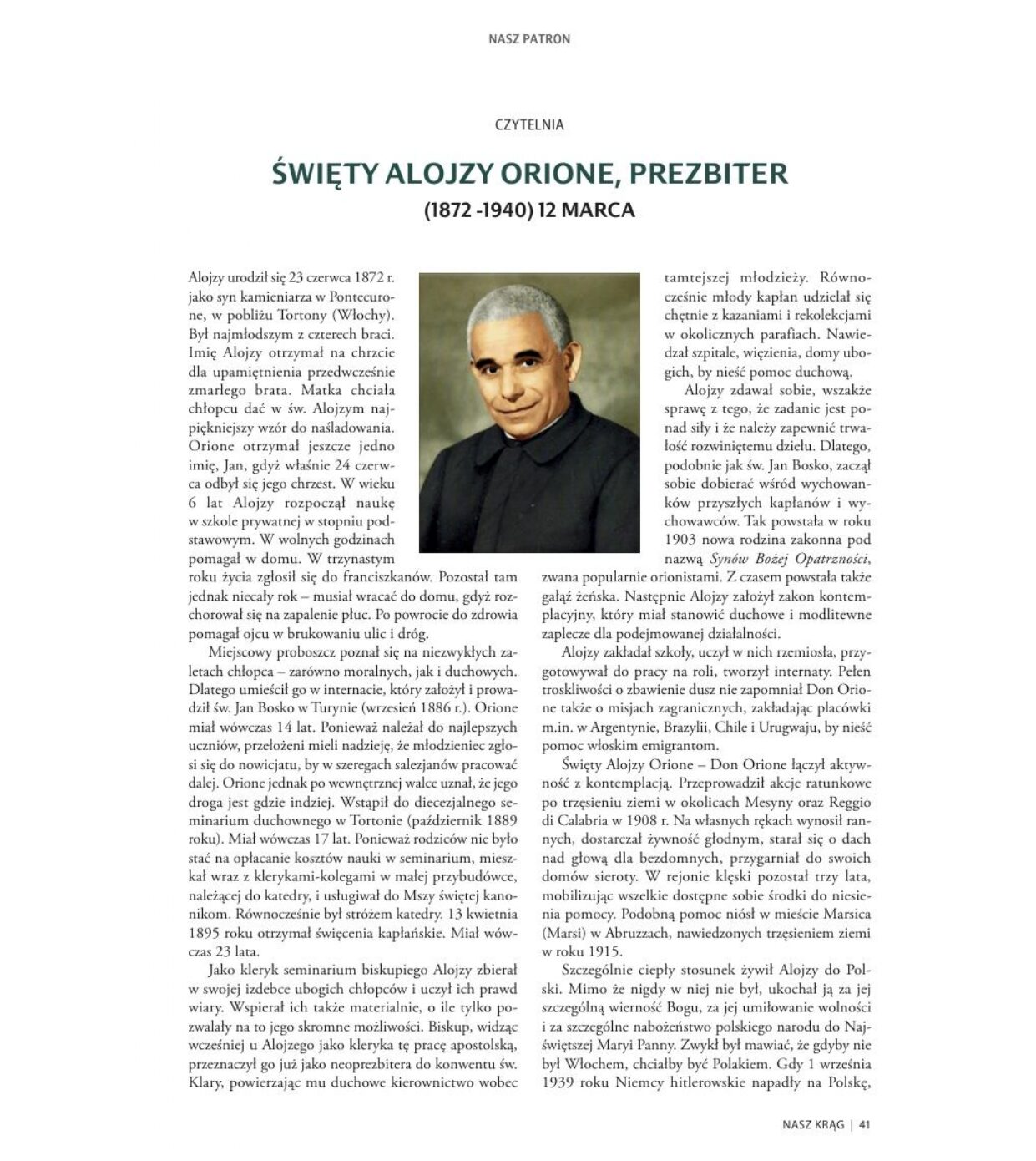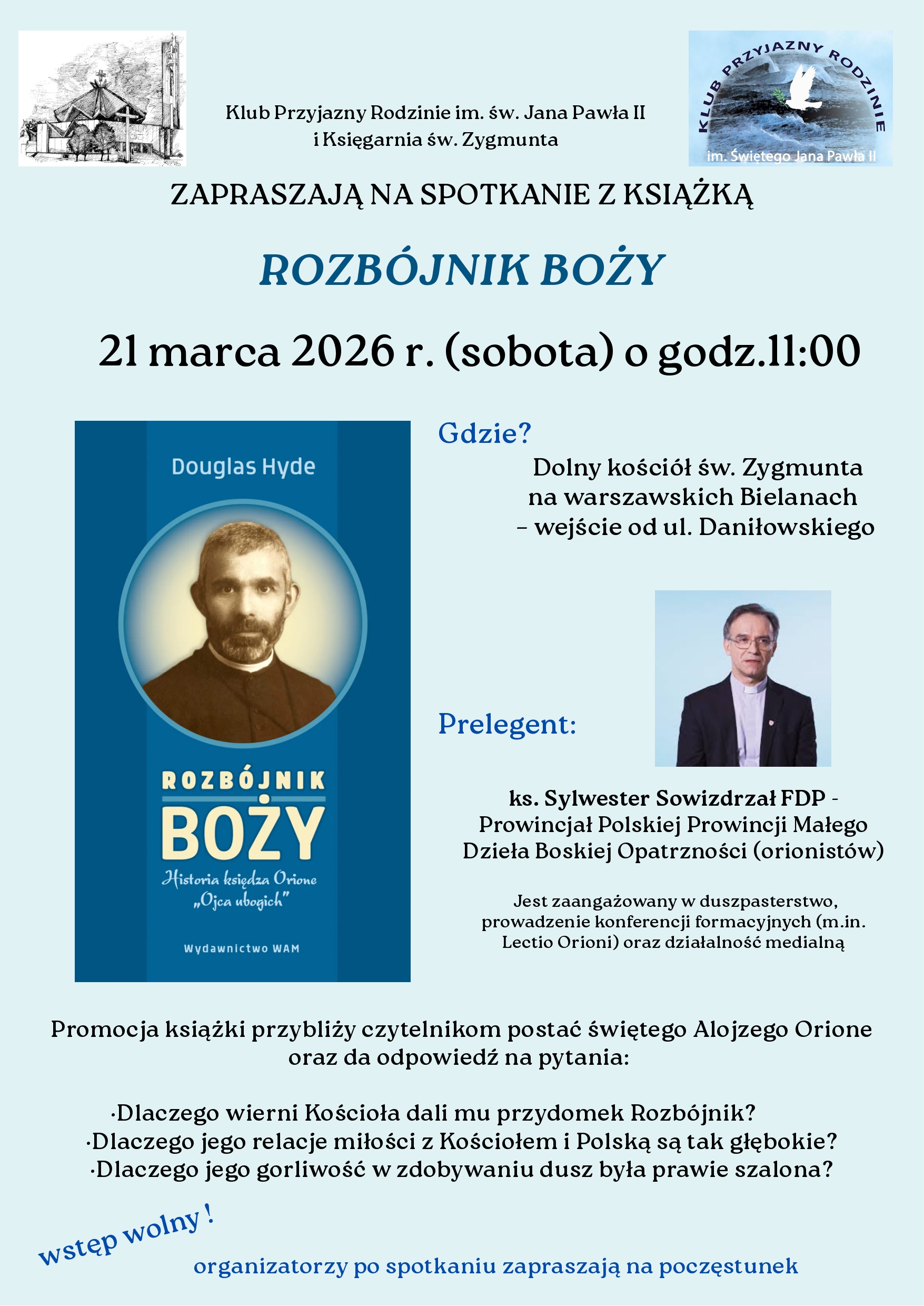 Głównym celem spotkania było przybliżenie zgromadzonym czytelnikom postaci świętego Alojzego Orione. Prelekcję wygłosił ksiądz Sylwester Sowizdrzał FDP, Prowincjał Polskiej Prowincji Małego Dzieła Boskiej Opatrzności. Podczas wydarzenia prelegent starał się odpowiedzieć na kilka intrygujących pytań dotyczących życia i działalności świętego. Zastanawiano się wspólnie, dlaczego wierni Kościoła nadali księdzu Orione tak nietypowy przydomek „Rozbójnik”, a także z jakiego powodu jego relacje miłości z Kościołem i Polską były aż tak niezwykle głębokie. Poruszona została również kwestia jego niemal szalonej gorliwości w zdobywaniu dusz ludzkich.